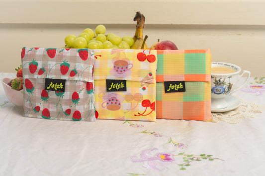 I ordered the new picnic collection, they are gorgeous! My favourite is the strawberry one. I love how big and durable the bags are, and how little room they take up in my bag. Shipping was very fast. I would love to see more gingham prints, maybe a floral/plant collection (roses, daisies, ivy, eucalyptus etc.).